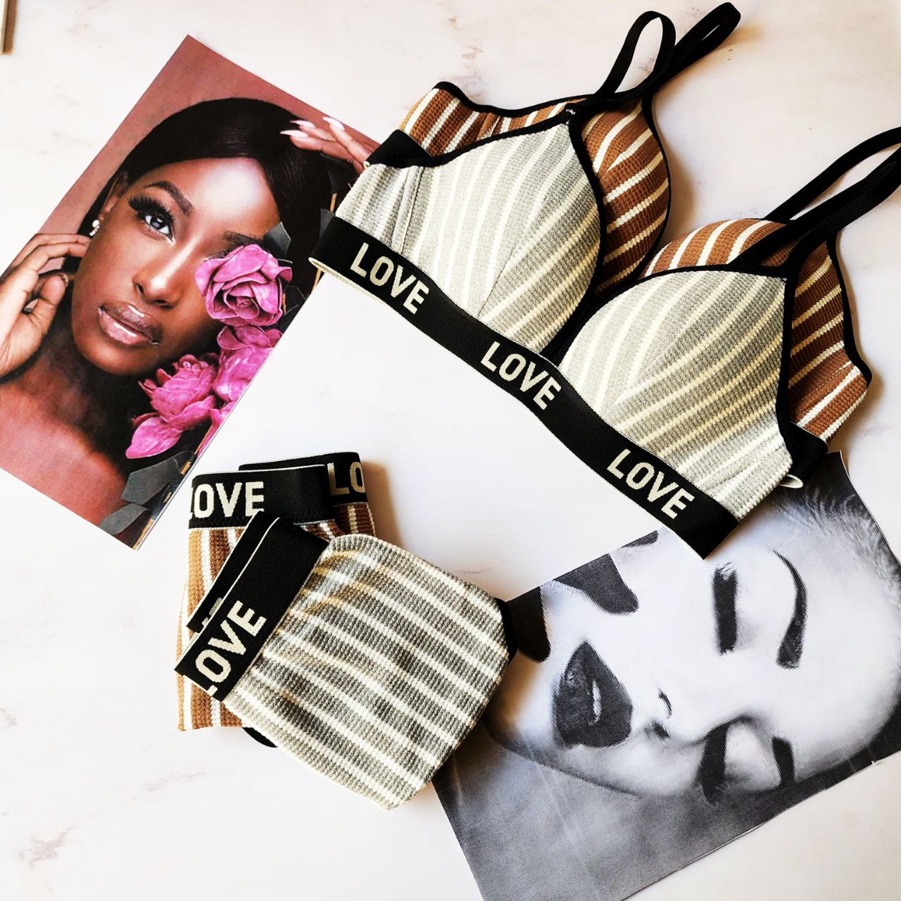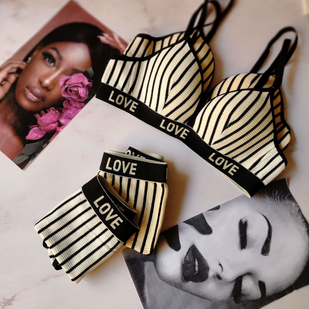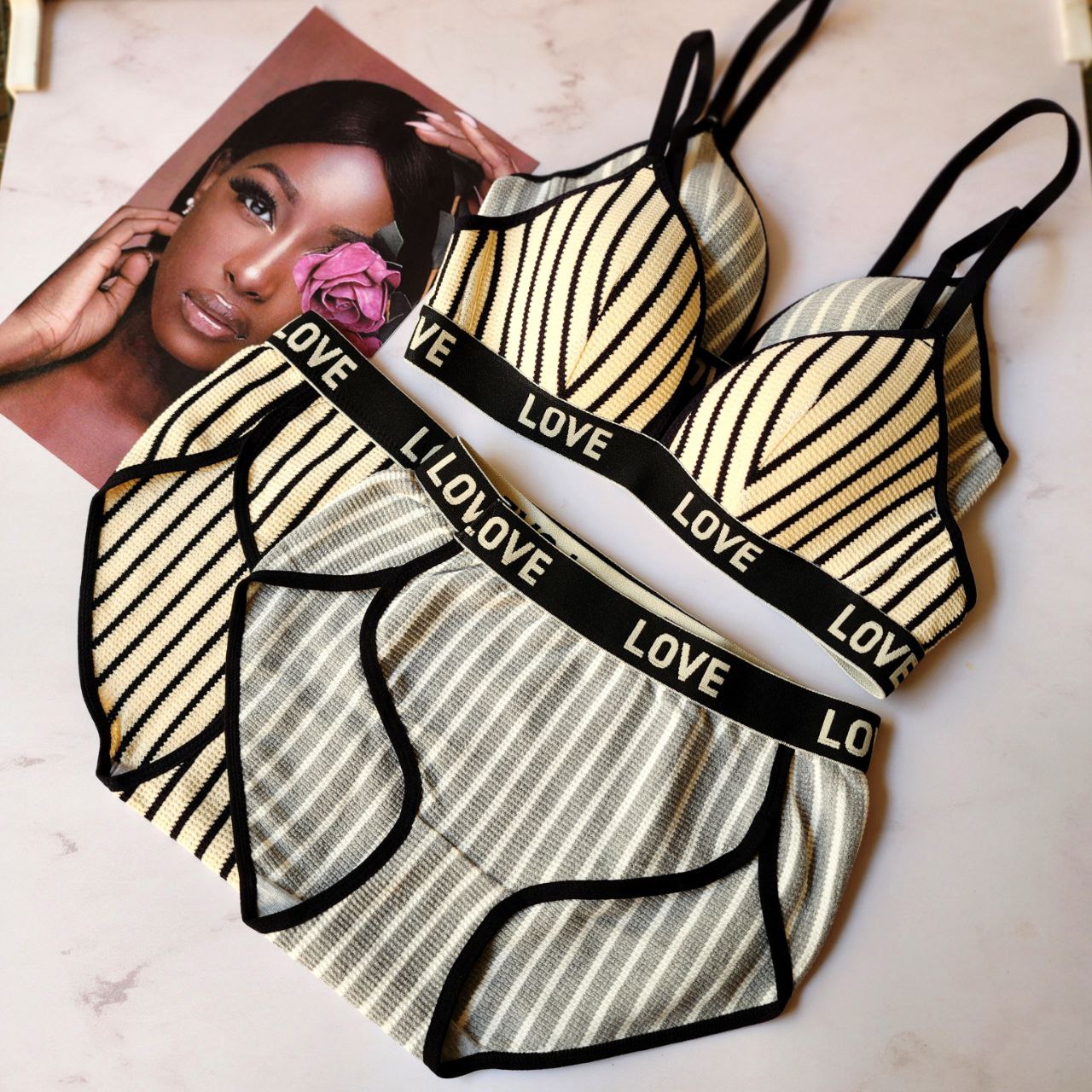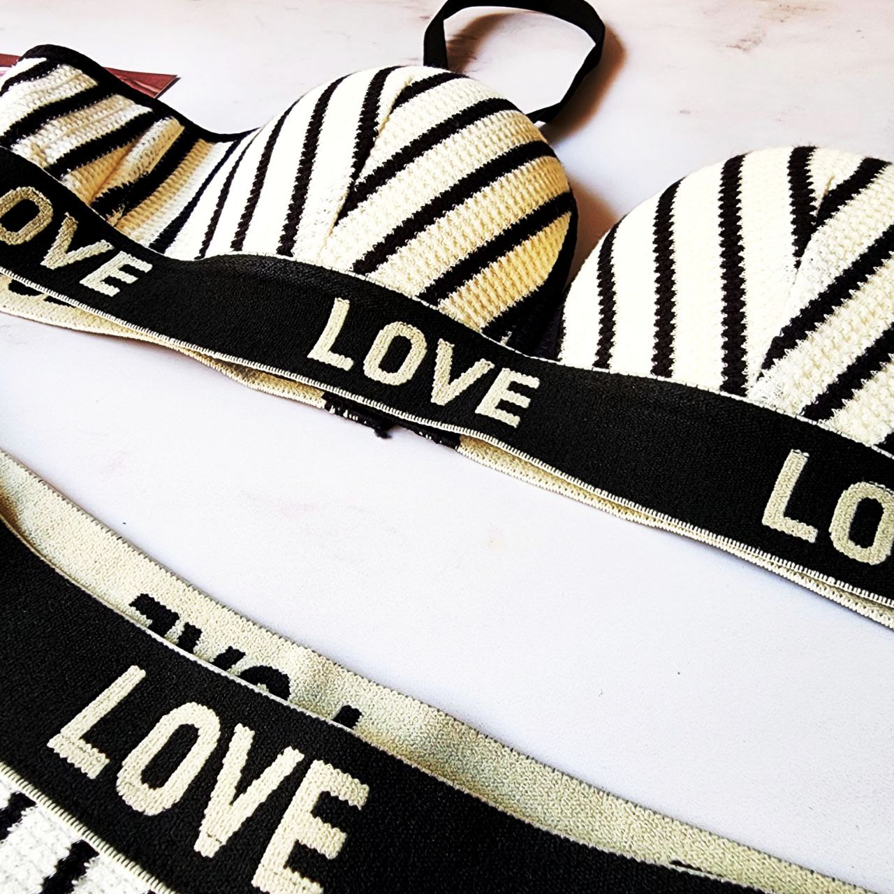 این ست لباس زیر کشبافت با طراحی راه راه و کش پهن «LOVE»، ترکیبی از راحتی و زیبایی است. جنس نرم و منعطف آن برای استفاده روزانه ایدهآل است. این ست در چهار رنگ جذاب و دو طرح متفاوت عرضه میشود. کش پهن زیر سینه و کمر علاوهبر حمایت مناسب، ظاهری مدرن و جذاب به آن میبخشد.